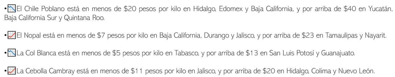 Los alimentos siguen registrando alzas de precio por factores como la inflación y desabasto. Algunos productos de la canasta básica que registran las mayores alzas son el trigo, el frijol, arroz, aguacate, el pan de caja, la chuleta de cerdo, la carne de res, el huevo, la leche, la papa y la cebolla.