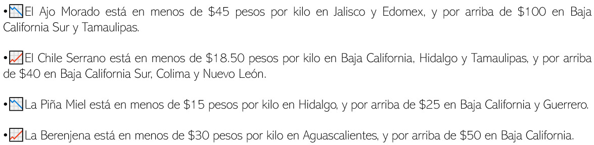 Los alimentos, bebidas y tabacos alcanzaron una inflación anual de 12.73 por ciento durante los primeros 15 días de agosto, mientras que las mercancías subieron 10.43%; los productos pecuarios, agropecuarios, frutas y verduras aumentaron 14.69, 14.50 y 14.27%, respectivamente, en el periodo de referencia.