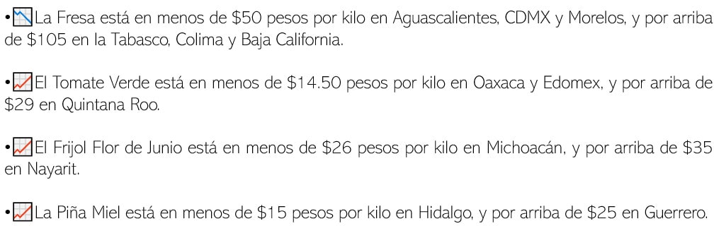 Es el caso del jitomate saladet, que el pasado 23 de septiembre se pagó a los productores a razón de 6.3 pesos por kilogramo, para venderse al consumidor a un precio promedio de 27.4 pesos, lo que implica un margen de comercialización de 333%. Destaca también el caso de la cebolla blanca –uno de los artículos de mayor encarecimiento anual de acuerdo con cifras del Inegi– que se pagó a los productores a razón de 13.3 pesos por kilogramos, pero llegó a manos de los consumidores a un precio de 52.8 pesos por kilogramo, es decir 299% más cara.