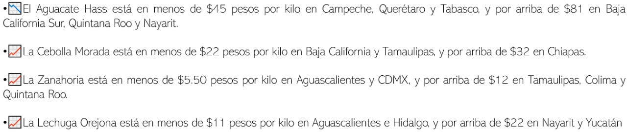 La Alianza Nacional de Pequeños Comerciantes (ANPEC) encontró alza de precios en 32 de los 44 productos de la canasta básica en el último estudio realizado del 15 de agosto al 15 de septiembre. Las alzas fueron lidereadas por la cebolla, que pasó de $17.00 a $54.00; seguida de la papa, de $30.00 a $64.00; ambas variaciones reportadas en Hidalgo; el tercer y cuarto producto con mayor variación, el chile que pasó de $20.00 a $36.00 y el limón que el mes pasado se encontraba en $17.00 y ahora en $31.00, ambos en Morelos, y en quinto lugar la zanahoria, que pasó de $20 a $28.00 en Oaxaca.
