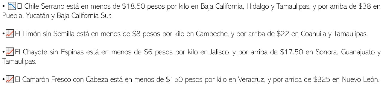 “(...)Debe aprovecharse la fortuna de la vecindad con EU con oportunidades para los ámbitos pecuario, hortícola y frutícola. Hoy del 100% de las importaciones de verduras que realiza EU, 70% viene de México, lo que se replica para frutas con 60%. (...) Como quiera el PIB y las exportaciones seguirán su avance, pero también las importaciones sobre todo granos. Además en el ínter habrá que dejar atrás la inflación. Hoy justo los alimentos llevan la voz cantante.