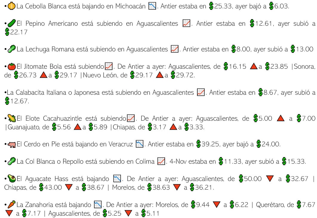 Durante la semana del 24 al 29 de octubre, los márgenes de intermediación de alimentos básicos continuaron altos en comparación con la semana del 17 al 21 del mismo mes y, en el caso de algunos productos, continuaron con incrementos (...) en el caso del jitomate, la cadena de comercialización, es decir, los intermediarios, impulsan su encarecimiento en 343% y, para la naranja valenciana, lo hacen en 466%.