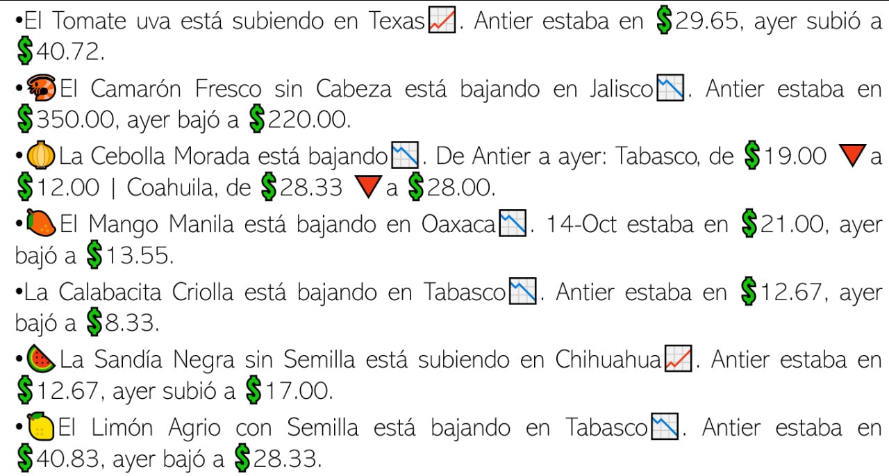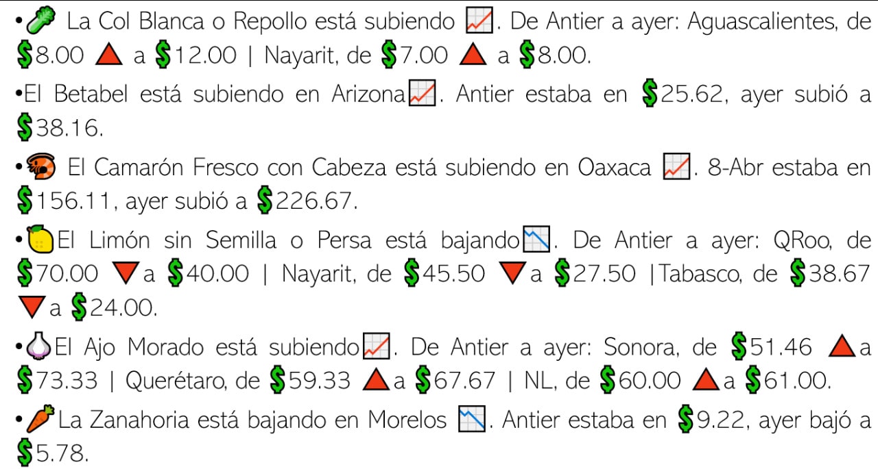 “De acuerdo con la Unión de Trabajadores Agrícolas (UNTA) en la semana que terminó, el precio promedio de la tortilla en nuestro país alcanzó los 20 pesos por kilogramo en tortillerías tradicionales y 13 pesos en tiendas de autoservicio, representando incrementos de 24 y 11 por ciento con relación a 2021 (...)”