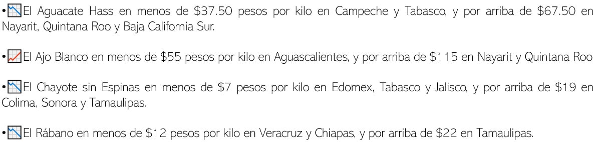 Estas variaciones se repiten en el resto de los alimentos agropecuarios: el jitomate de los productores de Sonora pasa de 7.07 pesos por kilogramo, a 11.00 y 12.94 pesos en las ventas de mayoreo y medio mayoreo en la Central de Abasto de la Ciudad de México, y luego hasta 29.22 pesos en las tiendas de autoservicio (...) las tiendas de autoservicio argumentan que los amplios márgenes de comercialización que aplican a los productos agropecuarios se atribuyen a los riesgos asociados a volatilidad y merma de las mercancías, sin embargo, consideró que aun descontando estos factores, “sigue siendo un valor altísimo y daña al consumidor”.